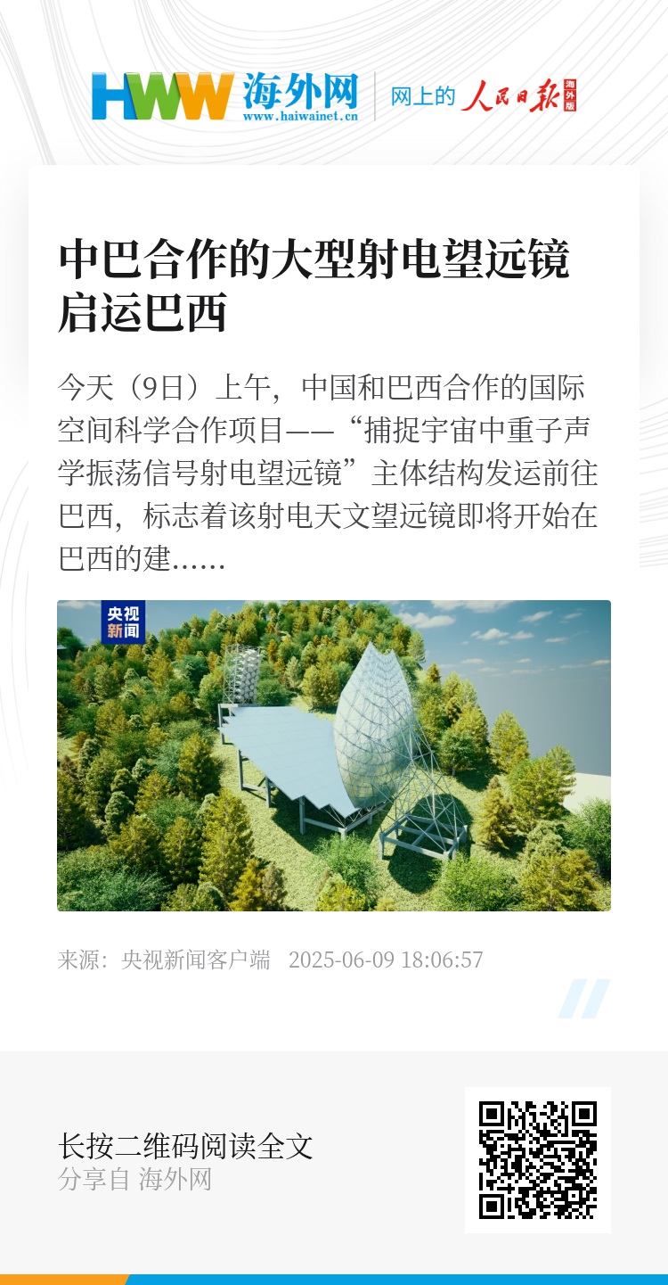 今天(9日)上午,中国和巴西合作的国际空间科学合作项目——“捕捉宇宙中重子声学振荡信号射电望远镜”主体结构发运前往巴西,标志着该射电天文望远镜即将开始在巴西的建设。
