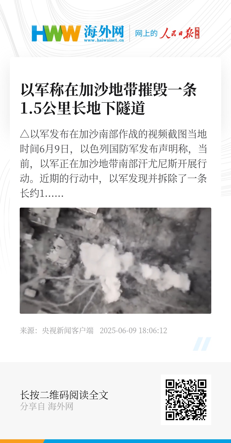 当地时间6月9日,以色列国防军发布声明称,当前,以军正在加沙地带南部汗尤尼斯开展行动。近期的行动中,以军发现并拆除了一条长约1.5公里的地下隧道,该隧道被巴勒斯坦伊斯兰抵抗运动(哈马斯)武装人员用作藏身之处,藏有数十件武器及弹药。
