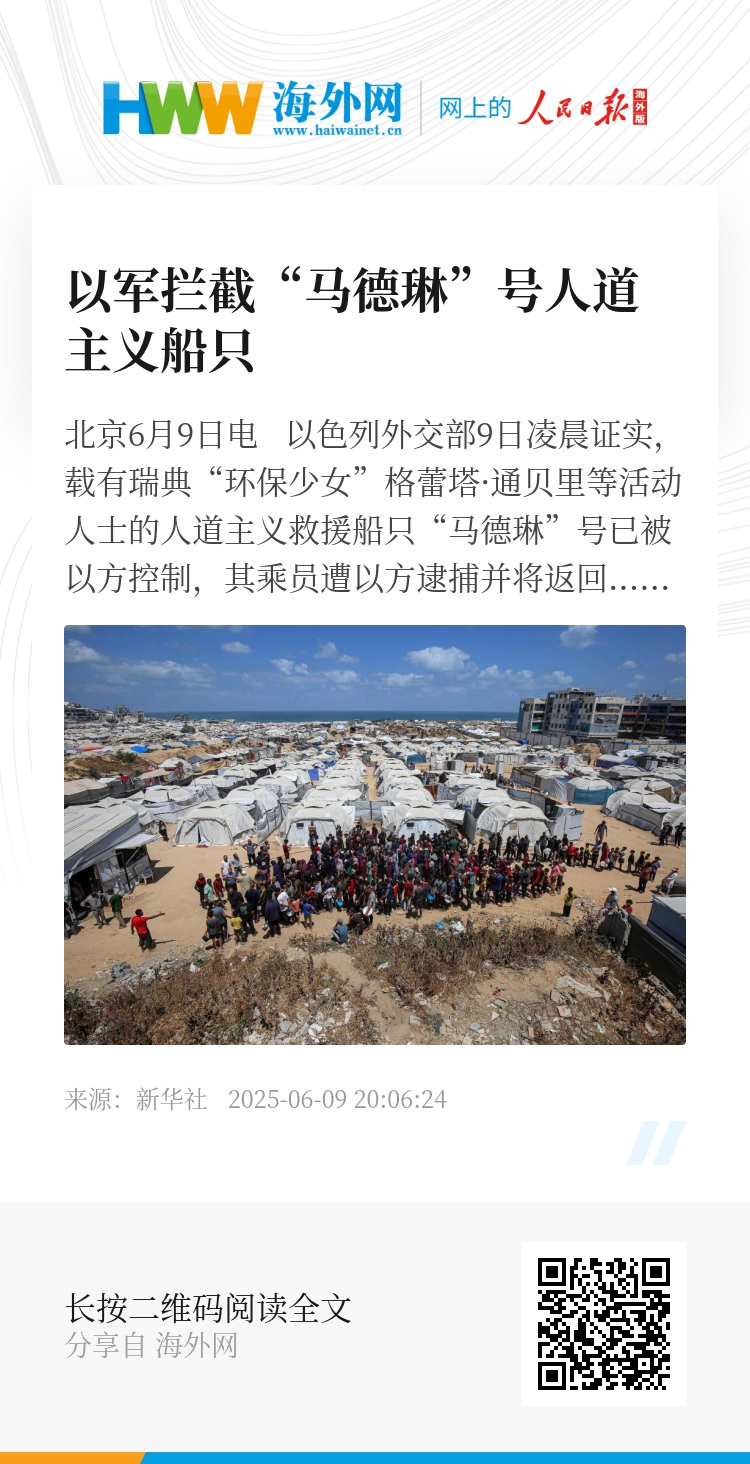 新华社北京6月9日电 以色列外交部9日凌晨证实,载有瑞典“环保少女”格蕾塔·通贝里等活动人士的人道主义救援船只“马德琳”号已被以方控制,其乘员遭以方逮捕并将返回各自所属国家。