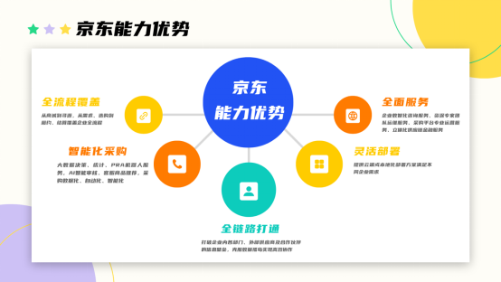 京东政企业务依托于京东供应链优势,打造了一站式数智化采购服务模式,聚焦企业采购全场景全流程智能化服务升级。通过人工智能、大数据、流程自动化等新技术,京东为企业提供智能认知引导、智能预测、AI采购大脑、智能选品、智能寻源、智能结算等多项服务,驱动企业采购每个环节数智化、智能化、平台化升级。同时,京东为企业嵌入数智化全流程员工服务模式,助力企业提升福利管理效能,优化福利运营成本,满足员工的多样性需求,实现员工满意度与福利采购人工作效率的双重提升。