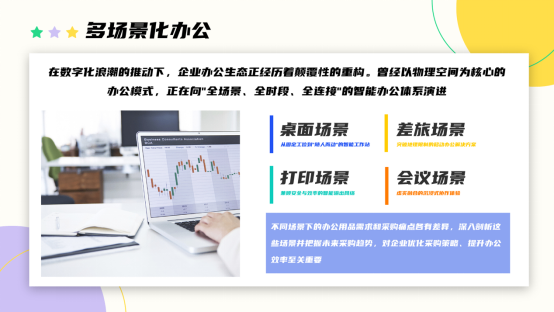 企业办公生态正从物理空间为核心的办公模式,向“全场景、全时段、全连接”的智能办公体系演进。报告指出,桌面场景、差旅场景、会议场景和打印场景成为企业办公的四大核心场景,而不同场景下的办公用品需求和采购痛点各有差异,但也为企业采购策略的优化提供了参考。