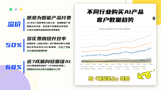 不同行业对AI产品的需求存在显著差异。报告显示,78%的企业愿为AI功能支付20%以上溢价,其中多以金融、科技等高端市场客户为主;68%的企业偏好轻量级AI工具,其中多以中小制造、教育等普惠市场客户为主。
