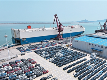 在江苏省连云港东方港务分公司码头,滚装轮停在泊位装载出口汽车。