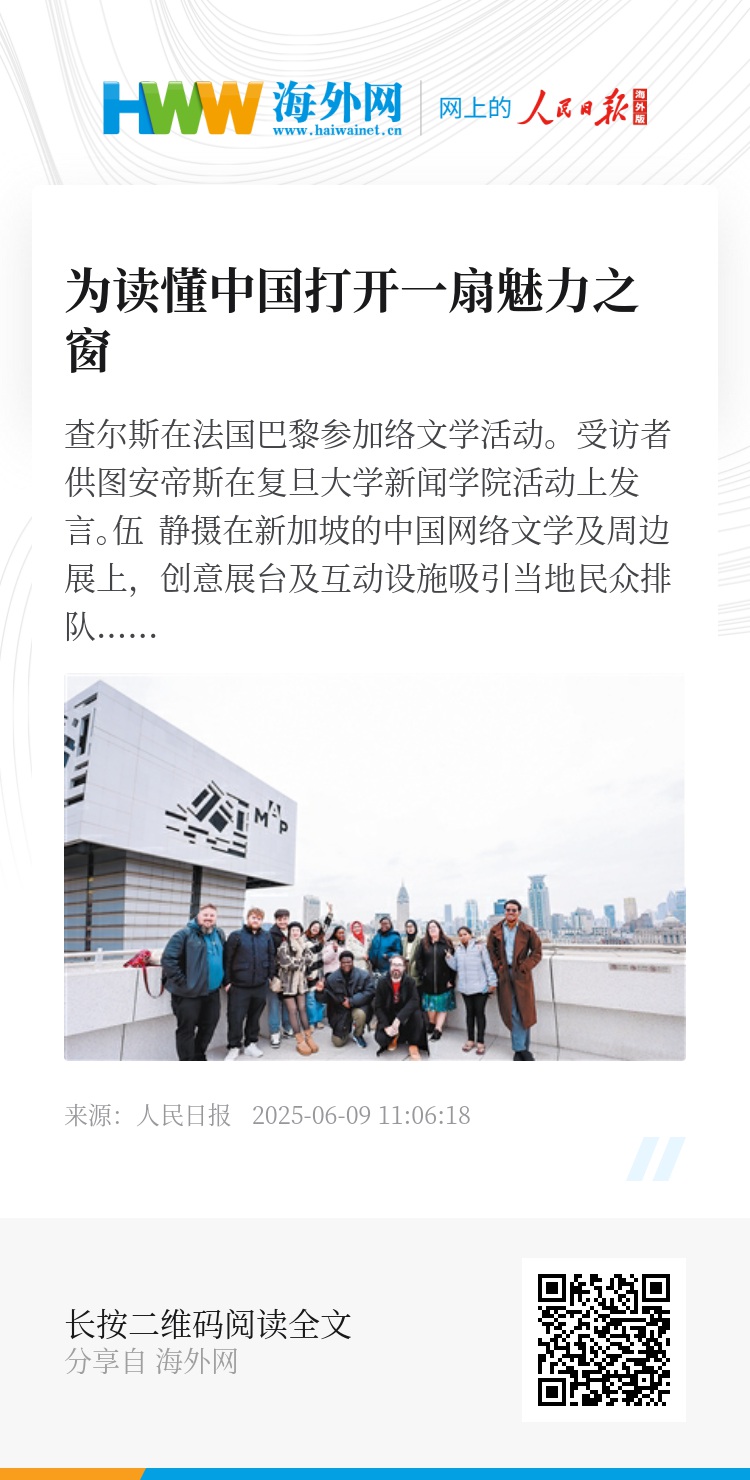 “中国网络文学凭借精彩的故事、奇幻的想象、动人的情感,引发不同文化背景人们的共鸣。伴随着阅读体验的提升,外国读者不仅对小说本身感兴趣,也开始希望深入了解中华文化。无论是超越现实的玄幻世界,还是现代的都市生活,这些中国网络文学作品成为人们接触和了解中国的一扇窗。”查尔斯说。
