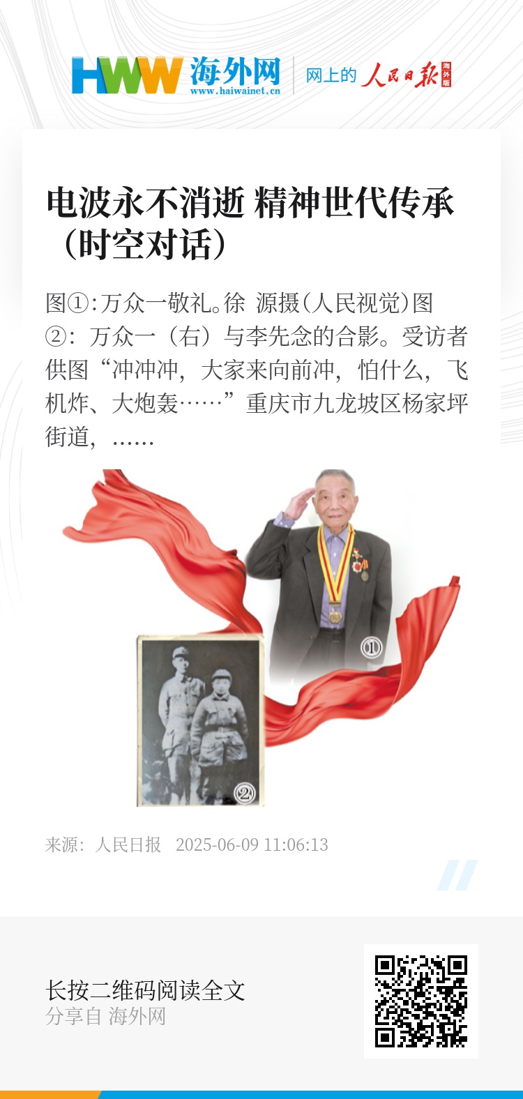 在与重庆科技大学青年们交流时,他说:“一个人活着就要像星星一样闪耀自己的光辉。”抗战时期,万众一传递的是情报;和平年代,他传递的是精神。两种力量穿越时空,激荡人心。