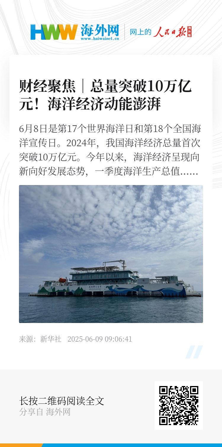 6月8日是第17个世界海洋日和第18个全国海洋宣传日。2024年,我国海洋经济总量首次突破10万亿元。