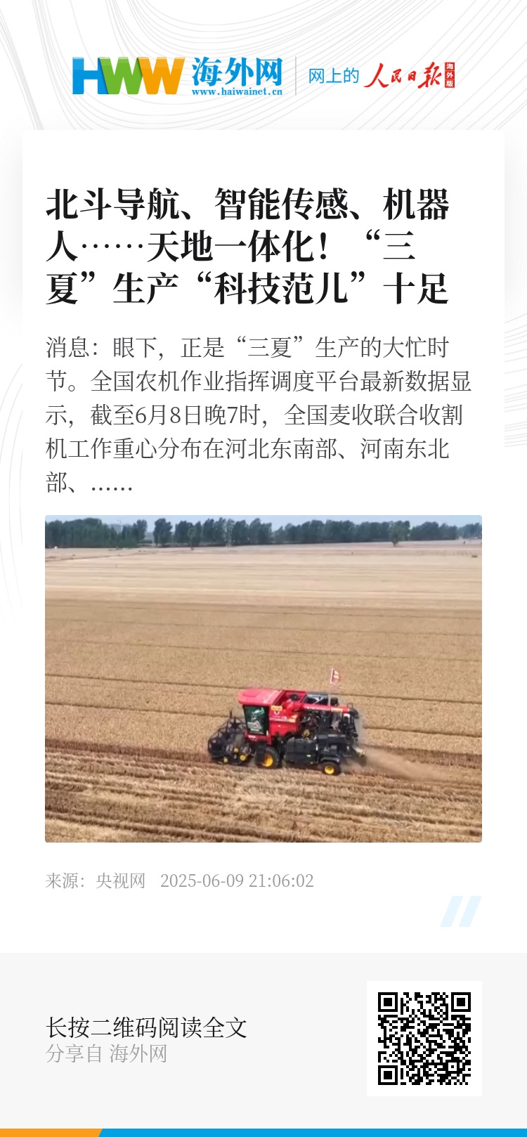 央视网消息:眼下,正是“三夏”生产的大忙时节。全国农机作业指挥调度平台最新数据显示,截至6月8日晚7时,全国麦收联合收割机工作重心分布在河北东南部、河南东北部、山东大部、江苏北部,以及陕西中部。6月9日起至6月11日,各地区持续晴好,要防范高温暑热;陕西关中地区有降水过程,需加强关注。