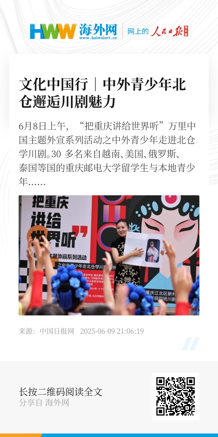 6月8日上午,“把重庆讲给世界听”万里中国主题外宣系列活动之中外青少年走进北仓学川剧。30 多名来自越南、美国、俄罗斯、泰国等国的重庆邮电大学留学生与本地青少年齐聚北仓文创园,共同体验川剧艺术,开启跨越国界的文化对话。