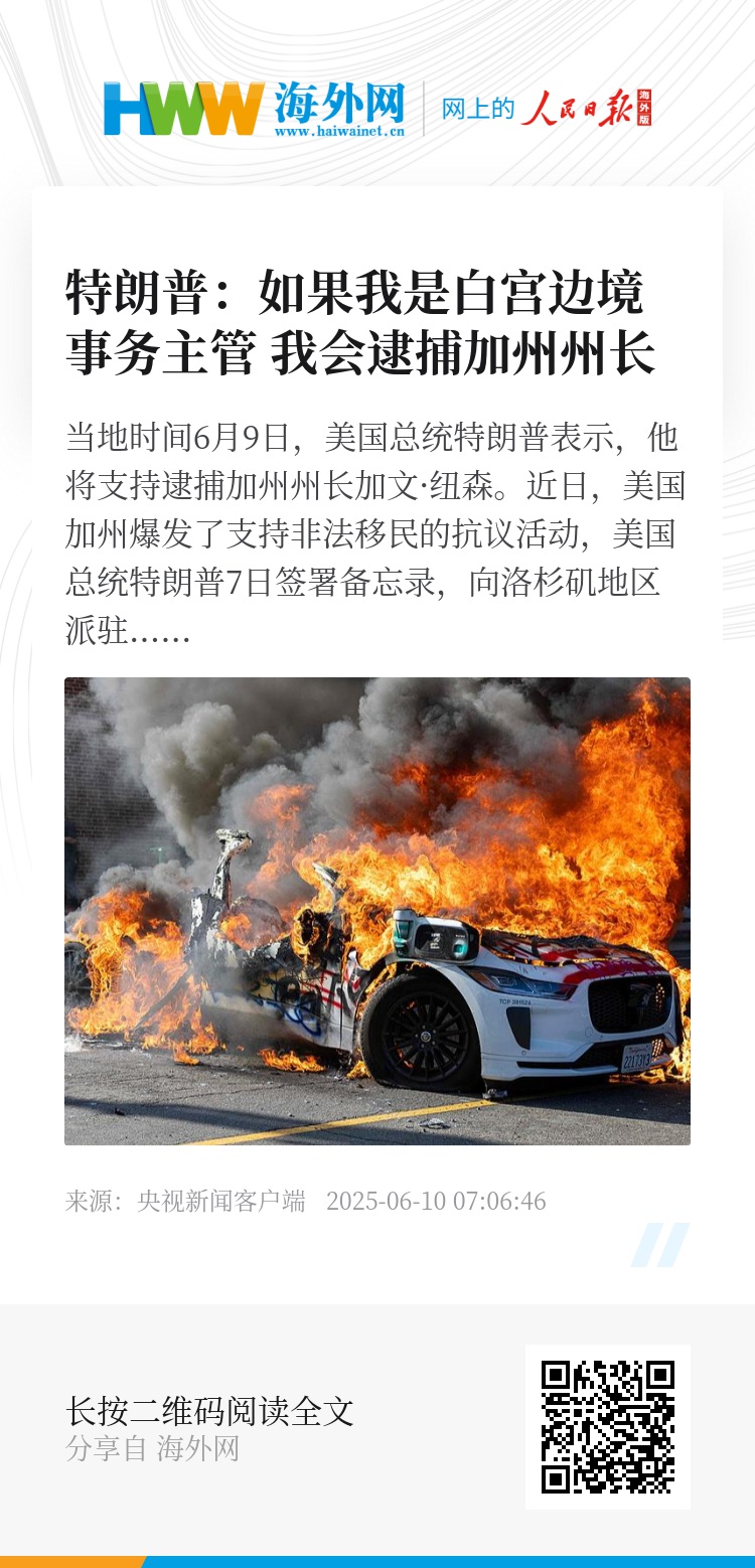 近日,美国加州爆发了支持非法移民的抗议活动,美国总统特朗普7日签署备忘录,向洛杉矶地区派驻2000名加州国民警卫队人员,引发纽森和洛杉矶市长巴斯的不满。美国白宫边境事务主管汤姆·霍曼7日称,要逮捕任何阻碍移民执法工作的人,包括加州州长纽森和洛杉矶市长巴斯。
