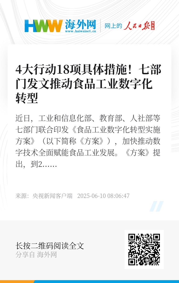 近日,工业和信息化部、教育部、人社部等七部门联合印发《食品工业数字化转型实施方案》(以下简称《方案》),加快推动数字技术全面赋能食品工业发展。