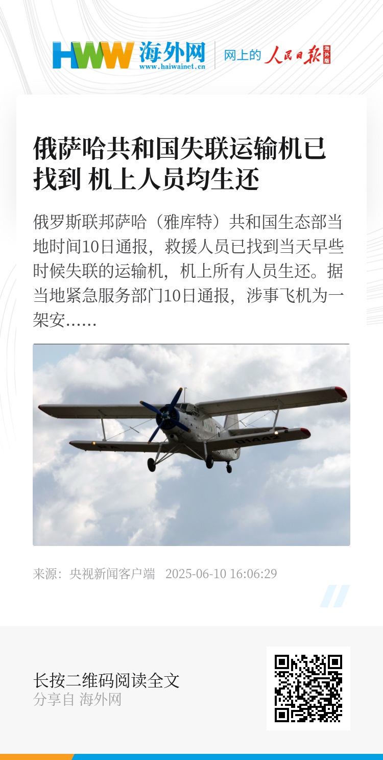 俄罗斯联邦萨哈(雅库特)共和国生态部当地时间10日通报,救援人员已找到当天早些时候失联的运输机,机上所有人员生还。