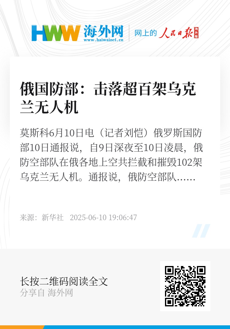 新华社莫斯科6月10日电(记者刘恺)俄罗斯国防部10日通报说,自9日深夜至10日凌晨,俄防空部队在俄各地上空共拦截和摧毁102架乌克兰无人机。