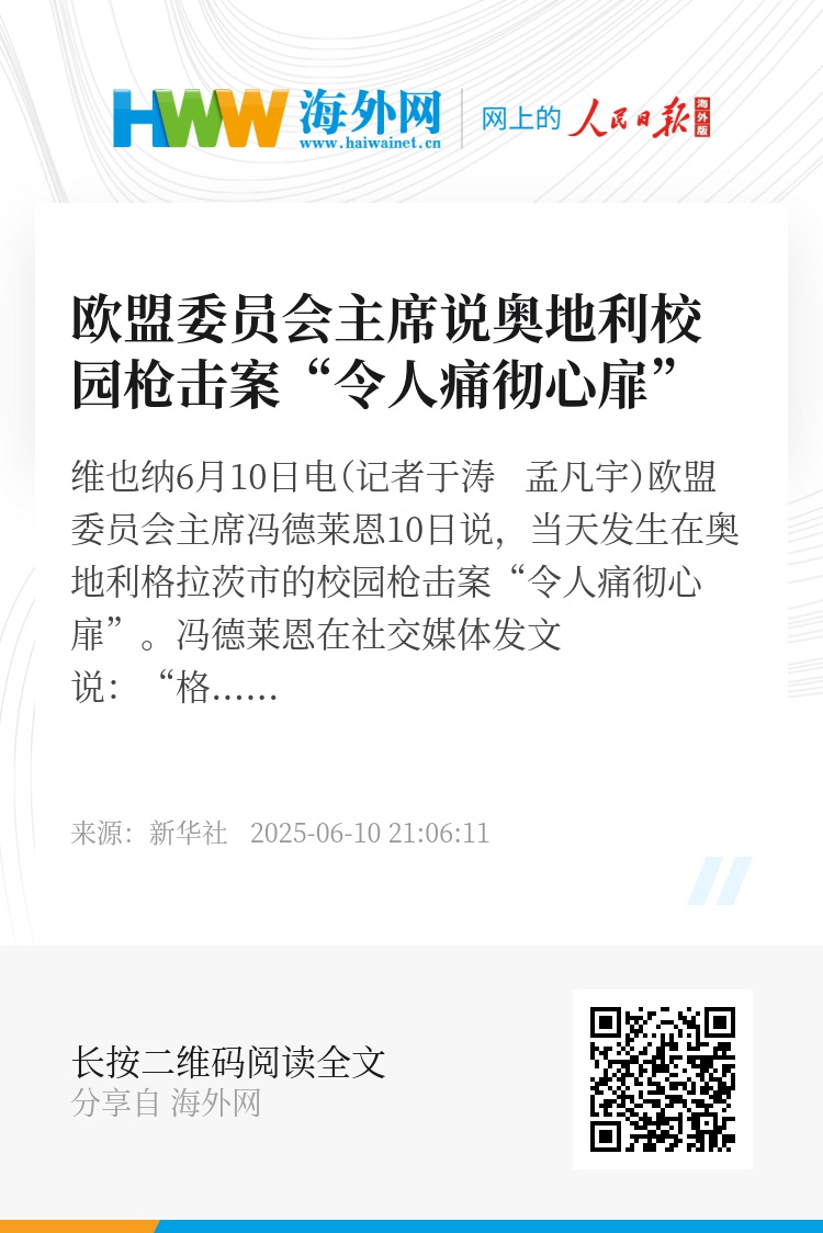 新华社维也纳6月10日电(记者于涛 孟凡宇)欧盟委员会主席冯德莱恩10日说,当天发生在奥地利格拉茨市的校园枪击案“令人痛彻心扉”。