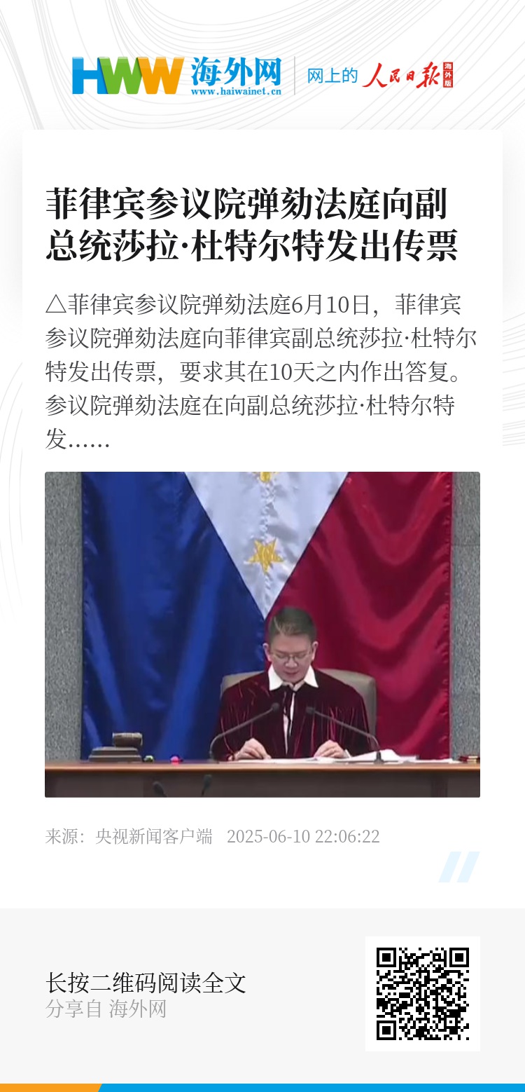 6月10日,菲律宾参议院弹劾法庭向菲律宾副总统莎拉·杜特尔特发出传票,要求其在10天之内作出答复。参议院弹劾法庭在向副总统莎拉·杜特尔特发出传票后宣布休庭。