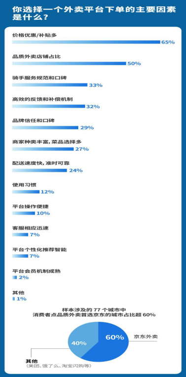 价格优惠、品质外卖占比、骑手服务规范和口碑成选择外卖平台TOP3标准,调查样本涉及的77个城市中,超60%的城市将京东外卖列为品质外卖首选平台。在北京、上海、广州等10个重点中大型城市,用户点品质外卖首选京东。