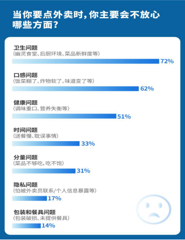 卫生、口感、健康成用户点外卖三大“品质焦虑”,72%的用户担忧卫生隐患,62%担心口感问题,51%担心健康问题。