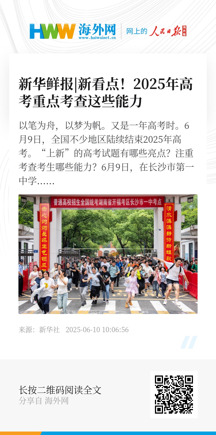 6月9日,全国不少地区陆续结束2025年高考。“上新”的高考试题有哪些亮点?注重考查考生哪些能力?