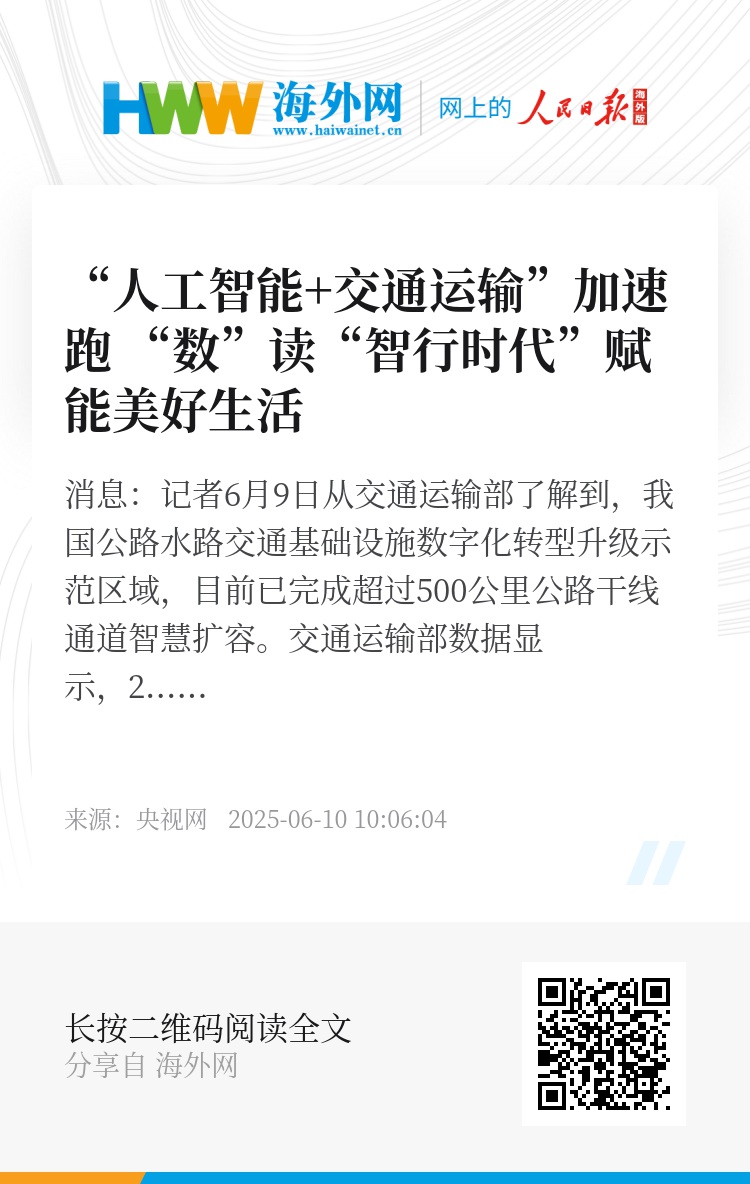 央视网消息:记者6月9日从交通运输部了解到,我国公路水路交通基础设施数字化转型升级示范区域,目前已完成超过500公里公路干线通道智慧扩容。