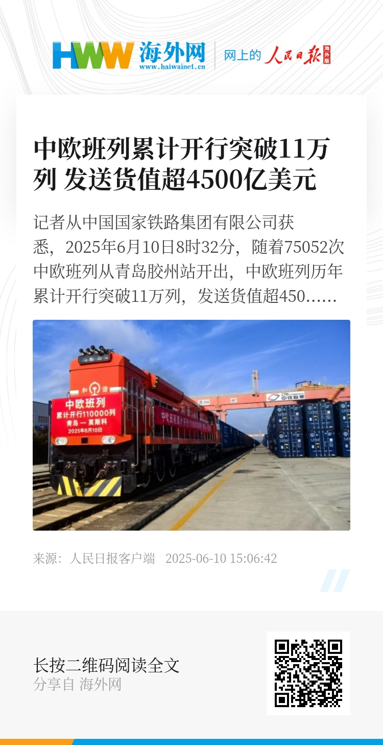 记者从中国国家铁路集团有限公司获悉,2025年6月10日8时32分,随着75052次中欧班列从青岛胶州站开出,中欧班列历年累计开行突破11万列,发送货值超4500亿美元。