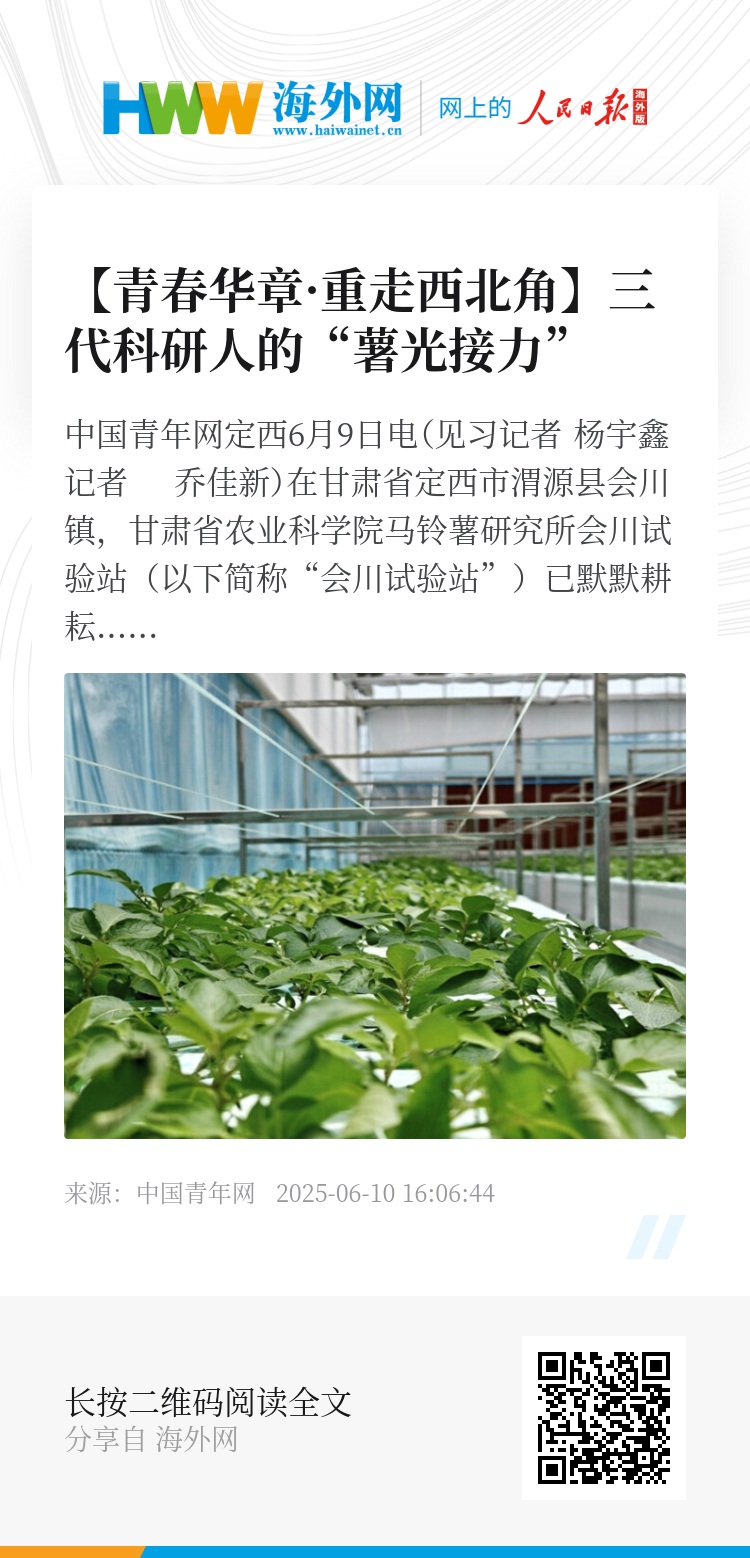 中国青年网定西6月9日电(见习记者 杨宇鑫 记者 乔佳新)在甘肃省定西市渭源县会川镇,甘肃省农业科学院马铃薯研究所会川试验站(以下简称“会川试验站”)已默默耕耘了60个春秋。这个始建于1965年的科研基地,累计孕育了50个马铃薯品种,为甘肃省马铃薯产业高质量发展提供了种源保障和科技支撑。6月8日,记者参加“青春华章·重走西北角”网络主题活动时深入会川试验站,聆听了三位不同代际科研工作者的故事,感受了一场跨越半个多世纪的“薯光接力”。