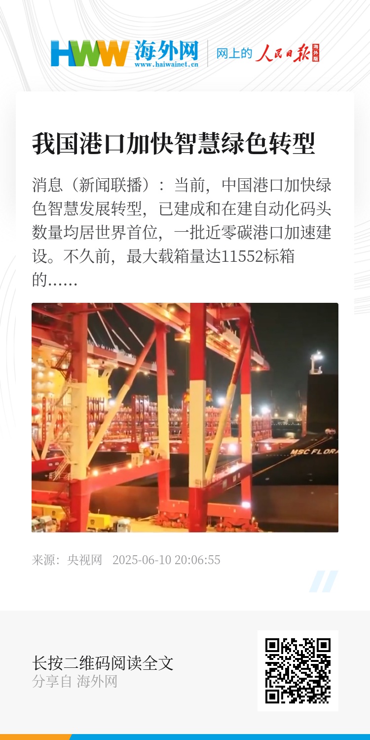 央视网消息(新闻联播):当前,中国港口加快绿色智慧发展转型,已建成和在建自动化码头数量均居世界首位,一批近零碳港口加速建设。