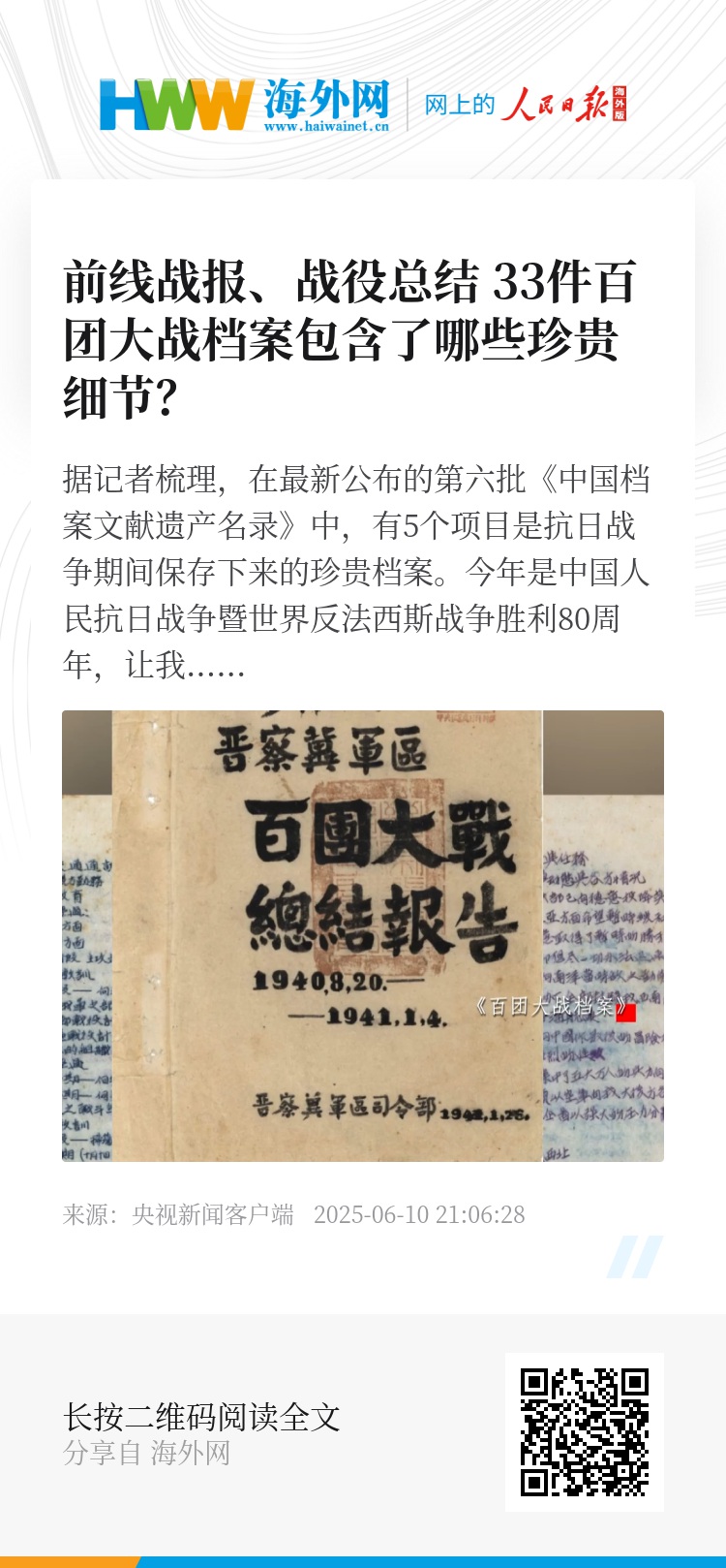据记者梳理,在最新公布的第六批《中国档案文献遗产名录》中,有5个项目是抗日战争期间保存下来的珍贵档案。今年是中国人民抗日战争暨世界反法西斯战争胜利80周年,让我们走近这些烽火岁月的史料遗存,重温档案里的抗战记忆。