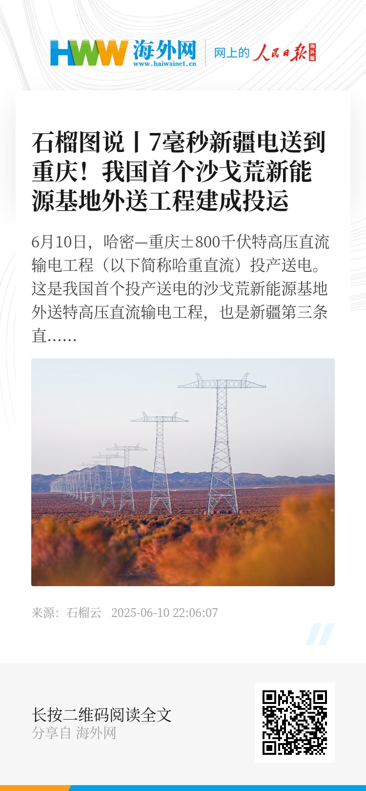 6月10日,哈密—重庆±800千伏特高压直流输电工程(以下简称哈重直流)投产送电。这是我国首个投产送电的沙戈荒新能源基地外送特高压直流输电工程,也是新疆第三条直流外送通道。