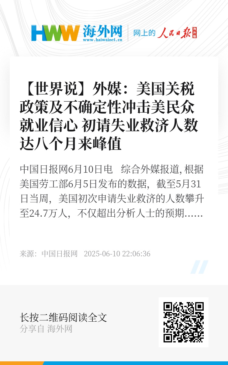 另据路透社报道,美国劳工部5日发布的报告还显示,美国的失业者很难找到新的就业机会,因为特朗普政府的贸易政策带来巨大不确定性,使得雇主招聘意愿减弱。牛津经济研究院首席美国经济学家南希·范登·豪滕(Nancy Vanden Houten)表示:“连续两周的初请失业金人数增长不容忽视,这可能是特朗普政府关税政策及不确定性导致就业市场疲软的信号。”