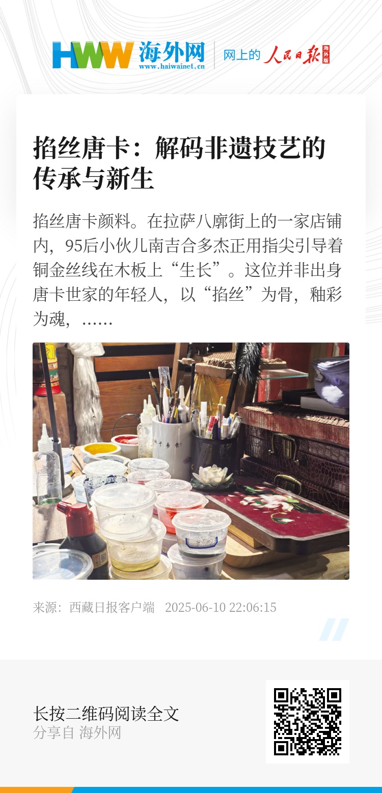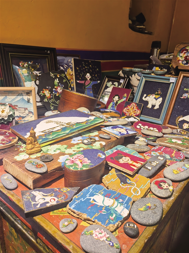 暮色温柔地漫入八廓街,游客的喧闹渐次平息。南吉合多杰捻亮案头那盏温暖的工作灯。光晕笼罩着他微微前倾的身影,也笼罩着木板上那幅还没完成的《冈仁波齐》——金属丝在柔光下静静闪烁,细若游丝,却透着一股韧劲。这门以铜丝为笔、釉彩为墨的手艺,于方寸木板上,在金属与矿粉的交织中,正安静地续写着自己的故事——微小如尘埃,却磅礴如永恒。