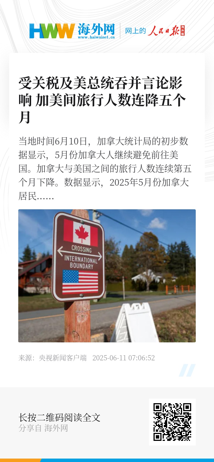 当地时间6月10日,加拿大统计局的初步数据显示,5月份加拿大人继续避免前往美国。加拿大与美国之间的旅行人数连续第五个月下降。