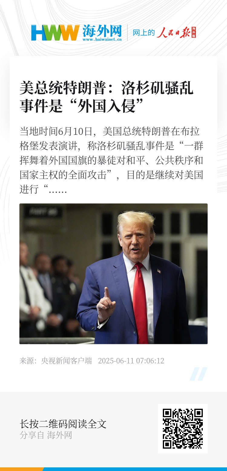 美国移民与海关执法局等联邦机构6日和7日出动大批执法人员,在洛杉矶县多地展开针对非法移民的搜捕行动,连续两日与当地社区居民发生严重冲突。7日,特朗普签署总统备忘录,在加州州长纽森没有请求支援的情况下,宣布向洛杉矶地区派驻2000名国民警卫队人员。