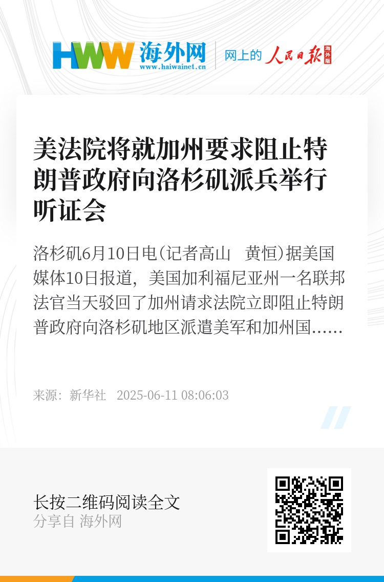 新华社洛杉矶6月10日电(记者高山 黄恒)据美国媒体10日报道,美国加利福尼亚州一名联邦法官当天驳回了加州请求法院立即阻止特朗普政府向洛杉矶地区派遣美军和加州国民警卫队的动议,但决定于12日就此动议举行听证会。