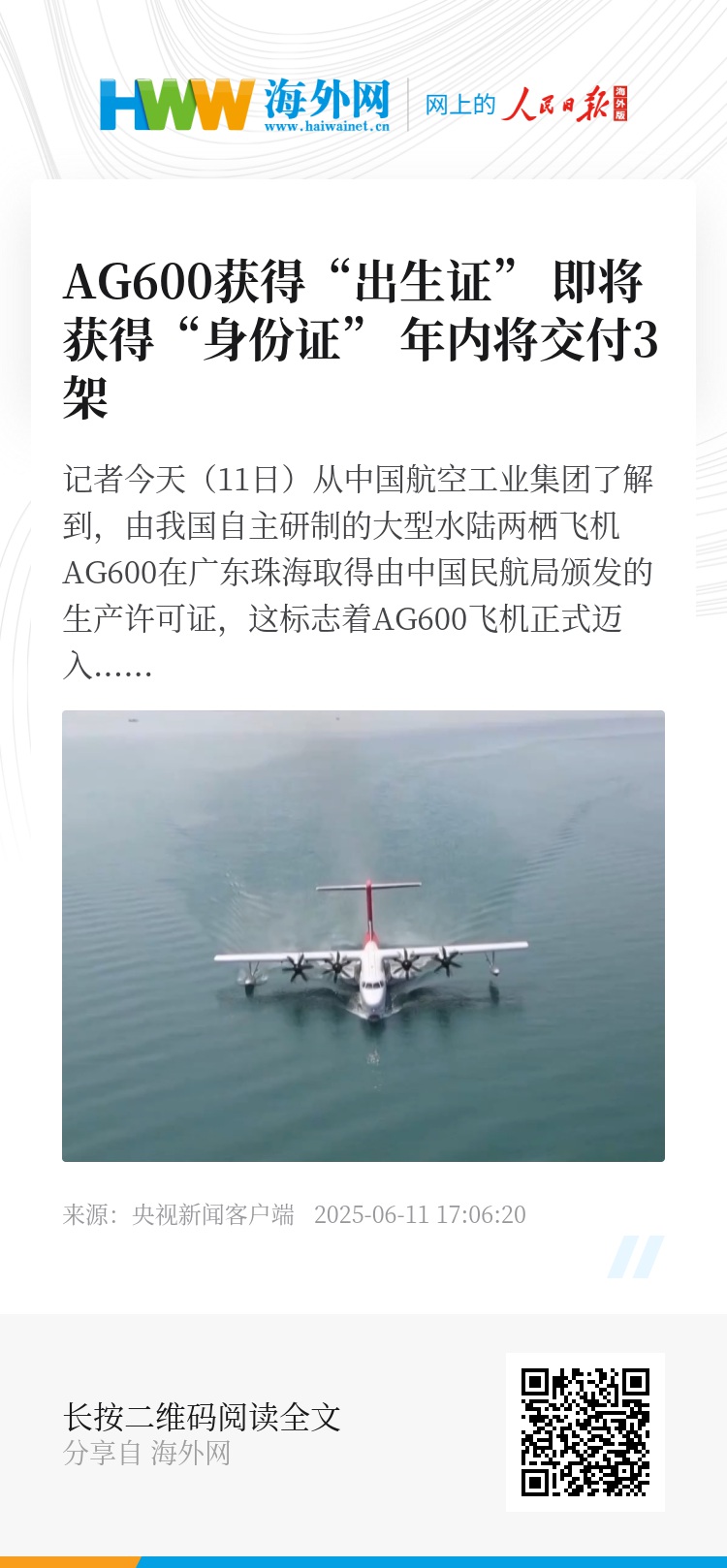 记者今天(11日)从中国航空工业集团了解到,由我国自主研制的大型水陆两栖飞机AG600在广东珠海取得由中国民航局颁发的生产许可证,这标志着AG600飞机正式迈入批量生产阶段。