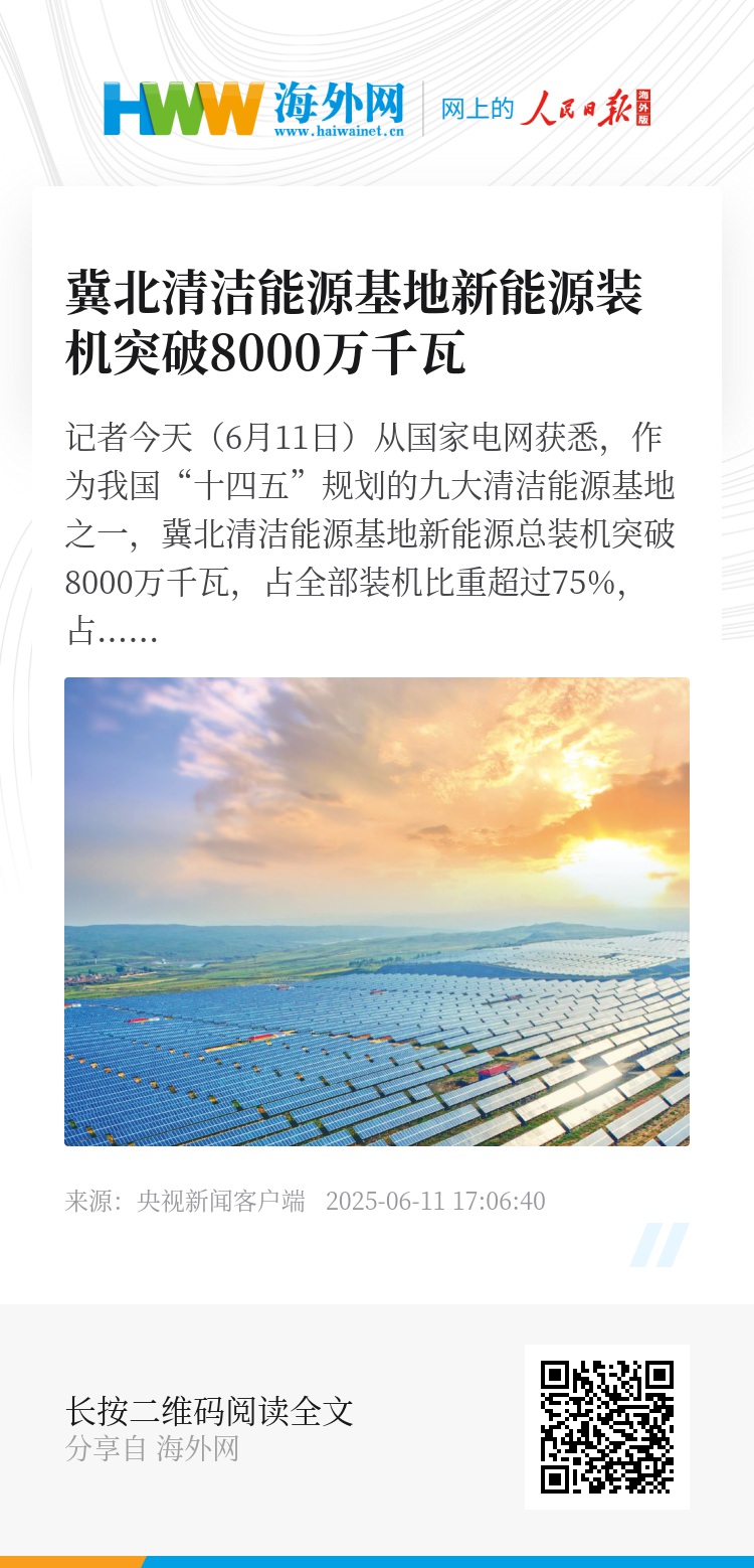 记者今天(6月11日)从国家电网获悉,作为我国“十四五”规划的九大清洁能源基地之一,冀北清洁能源基地新能源总装机突破8000万千瓦,占全部装机比重超过75%,占比居全国首位。