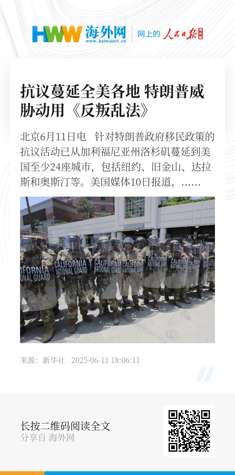 新华社北京6月11日电 针对特朗普政府移民政策的抗议活动已从加利福尼亚州洛杉矶蔓延到美国至少24座城市,包括纽约、旧金山、达拉斯和奥斯汀等。美国媒体10日报道,特朗普政府表示,仍将继续其针对移民的搜捕和驱逐,且不排除援引《反叛乱法》,赋予部署至洛杉矶应对抗议活动的士兵更大权力。