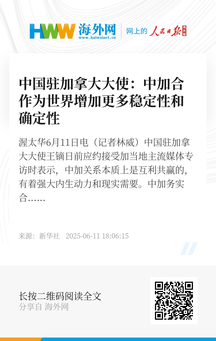 新华社渥太华6月11日电(记者林威)中国驻加拿大大使王镝日前应约接受加当地主流媒体专访时表示,中加关系本质上是互利共赢的,有着强大内生动力和现实需要。中加务实合作不仅助力各自经济发展,也能为世界增加更多稳定性和确定性。