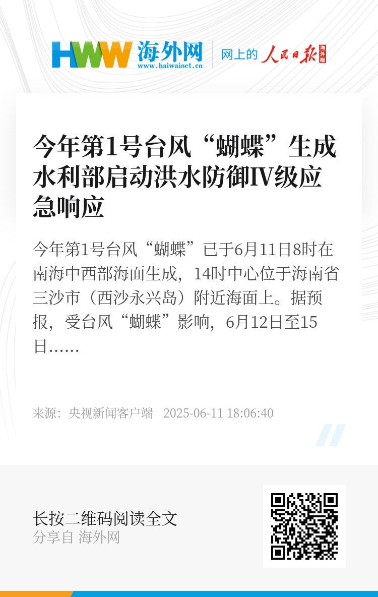 6月11日上午,水利部组织会商,安排部署台风“蝴蝶”暴雨洪水防御工作。依据《水利部水旱灾害防御应急响应工作规程》,水利部于11日14时针对福建、江西、湖南、广东、广西、海南6省(自治区)启动洪水防御Ⅳ级应急响应,要求6省(自治区)水利部门和相关流域管理机构密切关注台风、雨水情和汛情发展变化,加强监测预报预警和会商研判,系统、科学、安全、精准调度防洪工程体系,强化堤防巡查防守,切实落实水库及在建工程安全度汛措施,做好中小河流洪水和山洪灾害防御等工作,确保人民群众生命财产安全。水利部派出2个工作组,赴海南、广东等地协助指导台风“蝴蝶”暴雨洪水防御工作。
