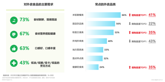 调研显示:外卖进一步高频化,20%的用户每日点外卖高达四次及以上,有七成消费者在点外卖时会产生“品质焦虑”,其中卫生、口感、健康成为三大核心焦虑点,因此更多消费者将“拥有实体门店” 列为点外卖的首要标准,会关注明厨亮灶以及商家资质、实地照片。消费者在外卖选择上也更加注重餐食的营养搭配和品质健康,在点单后会更加关注食材的新鲜程度、味道以及包装,力求获得品质餐品。有46%的用户表示,未来会增加外卖的金额,69%的用户称后续会点更高品质的餐食,如有机、轻食、品牌店等品质外卖。