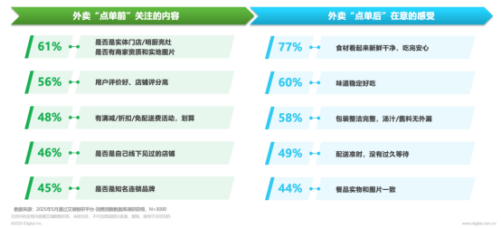在互联网信息的快速传播下,外卖行业也有着如行业乱象、食品安全问题、配送争议事件等,让消费者对外卖卫生、健康等问题的担忧如影随形。然而这并未阻挡消费者对外卖的热爱,反而促使他们更加主动地追求品质外卖。艾瑞调研数据显示,在点单前,消费者会综合考量诸多因素,会仔细查看商家是否有实体门店、明厨亮灶以及商家资质、实地照片,并参考真实用户的评价和店铺评分。点单后,他们还会关注食材的新鲜程度、味道以及包装,力求花费对应的价格获得对应品质的餐品。