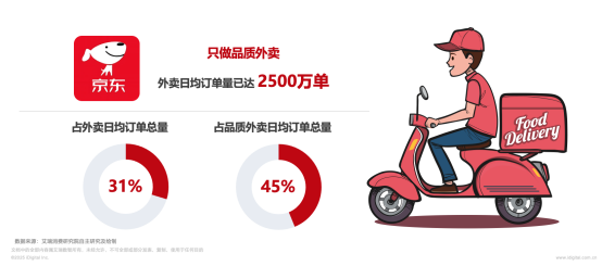 艾瑞报告指出,中国居民膳食结构正在演变,外卖行业正从"便捷优先"向"品质+健康"转型,与整体膳食消费升级趋势深度契合,外卖市场中品质外卖占比已达到了60%-70%,未来具备健康、品质的外卖产品将更具市场竞争力。2025年2月京东强势入局,以“品质堂食外卖”为核心定位,凭借严格的商家准入机制和差异化服务,迅速抢占市场,并推动行业向规范化、品质化、健康化方向升级。京东外卖日均订单量已突破2500万单,占据全国外卖市场超31%的份额,在品质外卖细分领域约有45%的市场占有率,与美团、饿了么共同构建起"三足鼎立"的行业新格局。