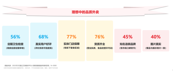 从消费金额看,62% 的消费者单人餐标准集中在 20-40 元区间,构成市场主流价格带。超4成消费者计划增加外卖支出,82% 的增支用户将 “选择更高品质餐食” 列为首要原因,反映出外卖消费呈现显著的品质升级趋势。外卖消费者正自发形成对品质外卖的追求,对品质外卖的追求已从被动规避风险转向主动构建筛选体系,形成了多维的品质评估框架。消费者将 “拥有实体门店” 列为品质外卖的首要标准,折射出对 “幽灵厨房” 的深层担忧;紧随其后的是对 “资质齐全” 的要求,凸显食品安全意识的全面觉醒。在基础门槛之上,消费者进一步提出品质体验升级诉求:期待真实透明的评价体系、要求后厨卫生定期公示,显示出对 “可见可控” 消费环境的渴望;而对知名连锁品牌的偏好、对 “图片与实物一致” 的执着,则表明标准化与信任感仍是市场稀缺资源。
