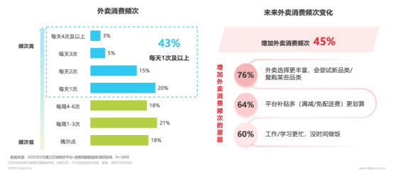 据艾瑞调研数据显示,消费者外卖消费频次在每天1次及以上的比例占43%,已近半数比例。 同时45%的消费者未来会增加外卖消费频次,外卖品类的日益丰富、平台的大力补贴以及消费者自身有限的时间精力,共同推动了外卖消费频次的增长,促使外卖消费深度融入都市生活。