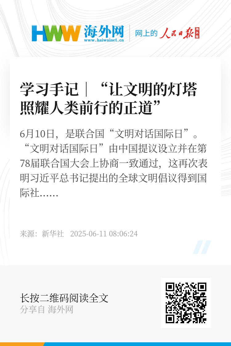 6月10日,是联合国“文明对话国际日”。“文明对话国际日”由中国提议设立并在第78届联合国大会上协商一致通过,这再次表明习近平总书记提出的全球文明倡议得到国际社会广泛响应,体现了世界百年变局中的人心所向。