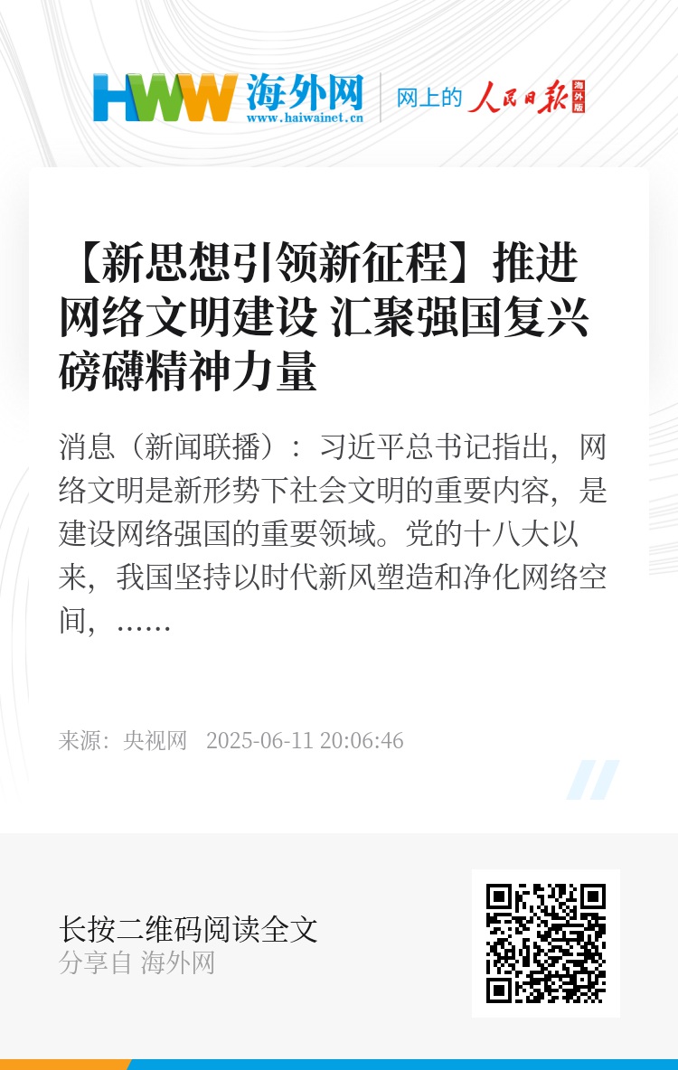 央视网消息(新闻联播):习近平总书记指出,网络文明是新形势下社会文明的重要内容,是建设网络强国的重要领域。党的十八大以来,我国坚持以时代新风塑造和净化网络空间,不断培育积极健康、向上向善的网络文化,网络文明建设取得明显成效,为强国建设、民族复兴伟业凝聚起强大精神力量。