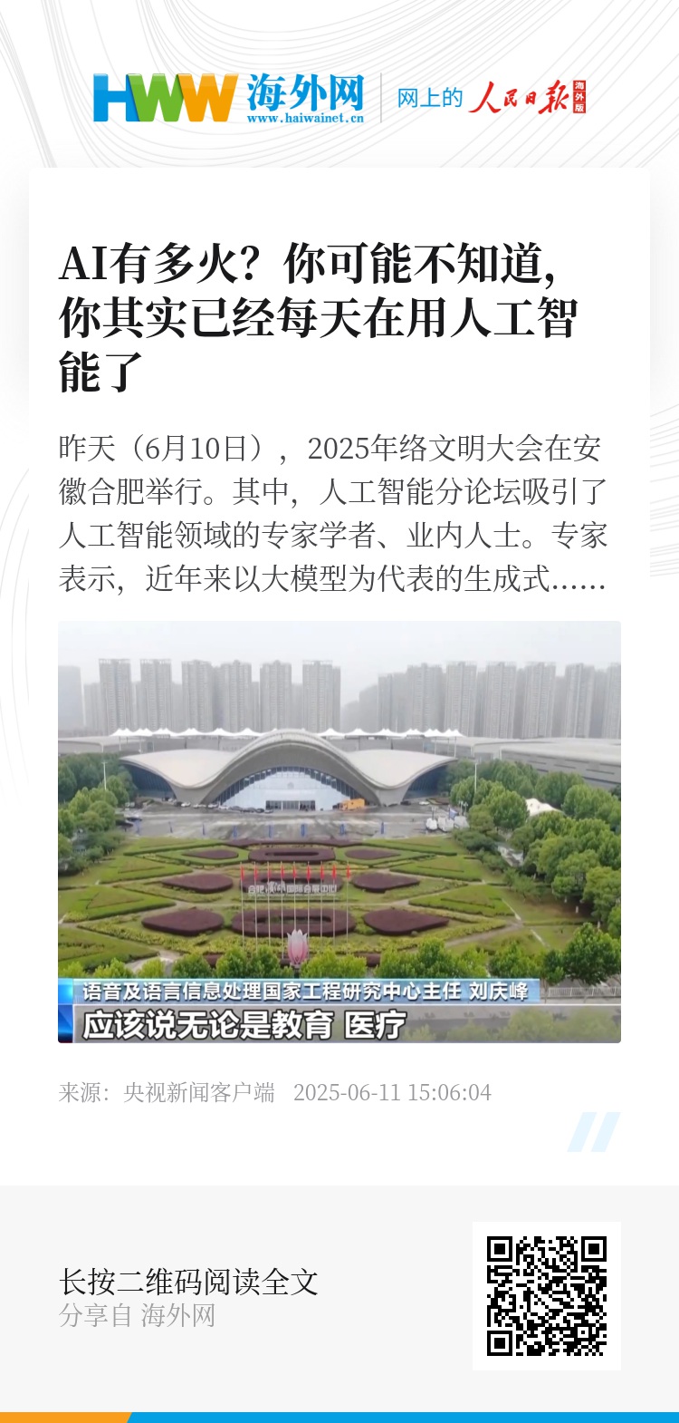 昨天(6月10日),2025年中国网络文明大会在安徽合肥举行。其中,人工智能分论坛吸引了人工智能领域的专家学者、业内人士。专家表示,近年来以大模型为代表的生成式人工智能异军突起,掀起了新一轮的人工智能开发与应用高潮。