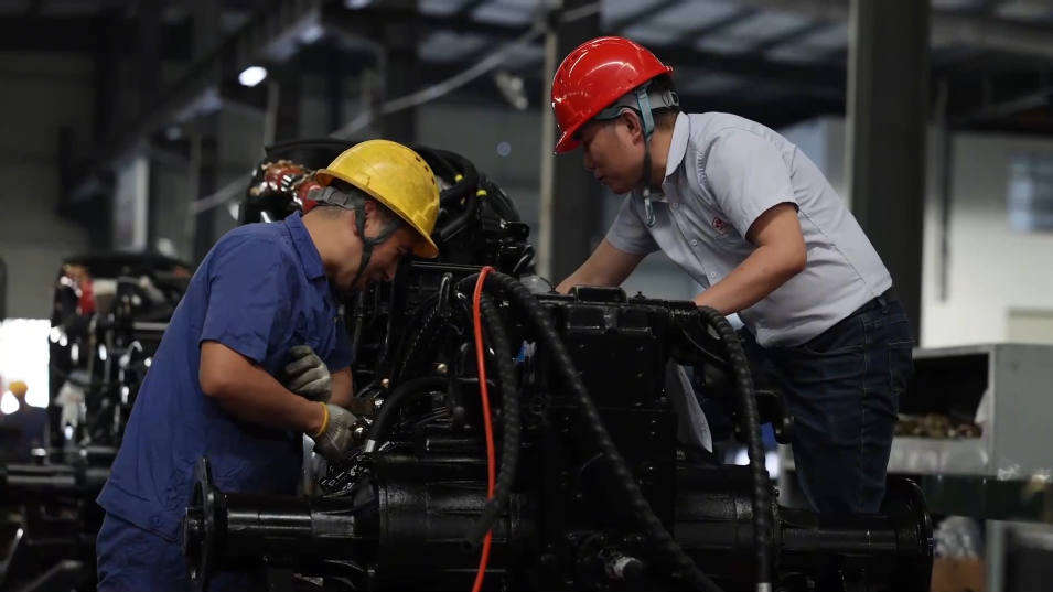 5月15日,在山东省青州经济开发区一家大型农机制造企业,工人调试检验出口海外的大马力拖拉机。新华社发(王继林 摄)