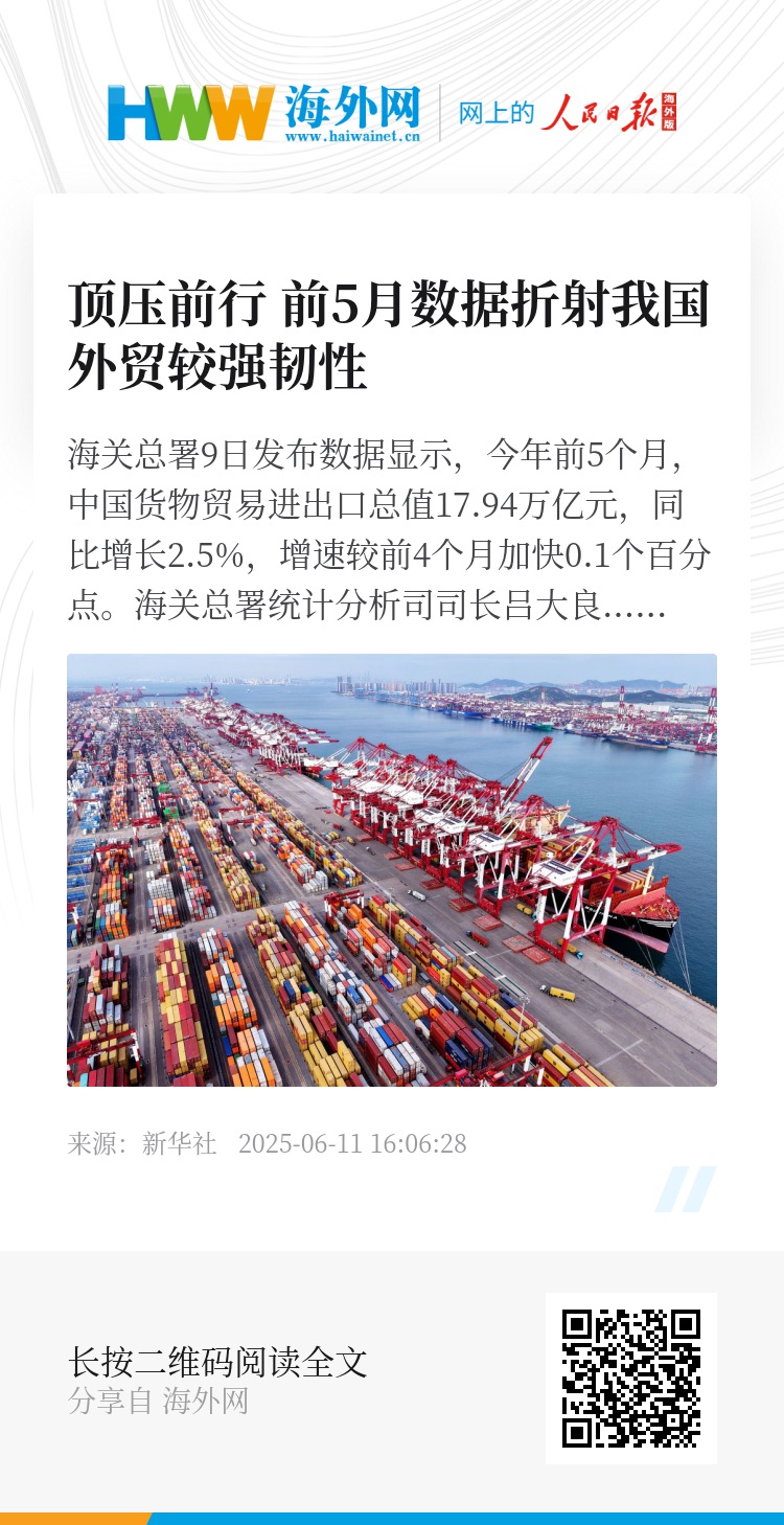 海关总署9日发布数据显示,今年前5个月,中国货物贸易进出口总值17.94万亿元,同比增长2.5%,增速较前4个月加快0.1个百分点。海关总署统计分析司司长吕大良表示,今年以来,中国经济持续回升向好,货物贸易在外部压力下保持较强韧性。
