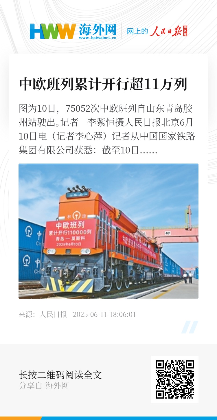 人民日报北京6月10日电(记者李心萍)记者从中国国家铁路集团有限公司获悉:截至10日,中欧班列累计开行超11万列(含回程),发送货值超4500亿美元,保持安全稳定畅通运行。
