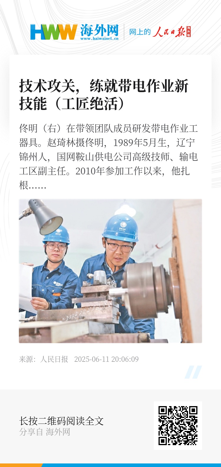近年来,佟明职工创新工作室累计获得国家发明专利授权10项,实用新型专利授权41项,相关成果获得省部级及以上奖励17项。“继承的是工匠精神,创新的是作业技术。”佟明说,未来希望能够带动更多青年人扎根一线,为保障电力输送作出更多贡献。(记者 辛 阳)