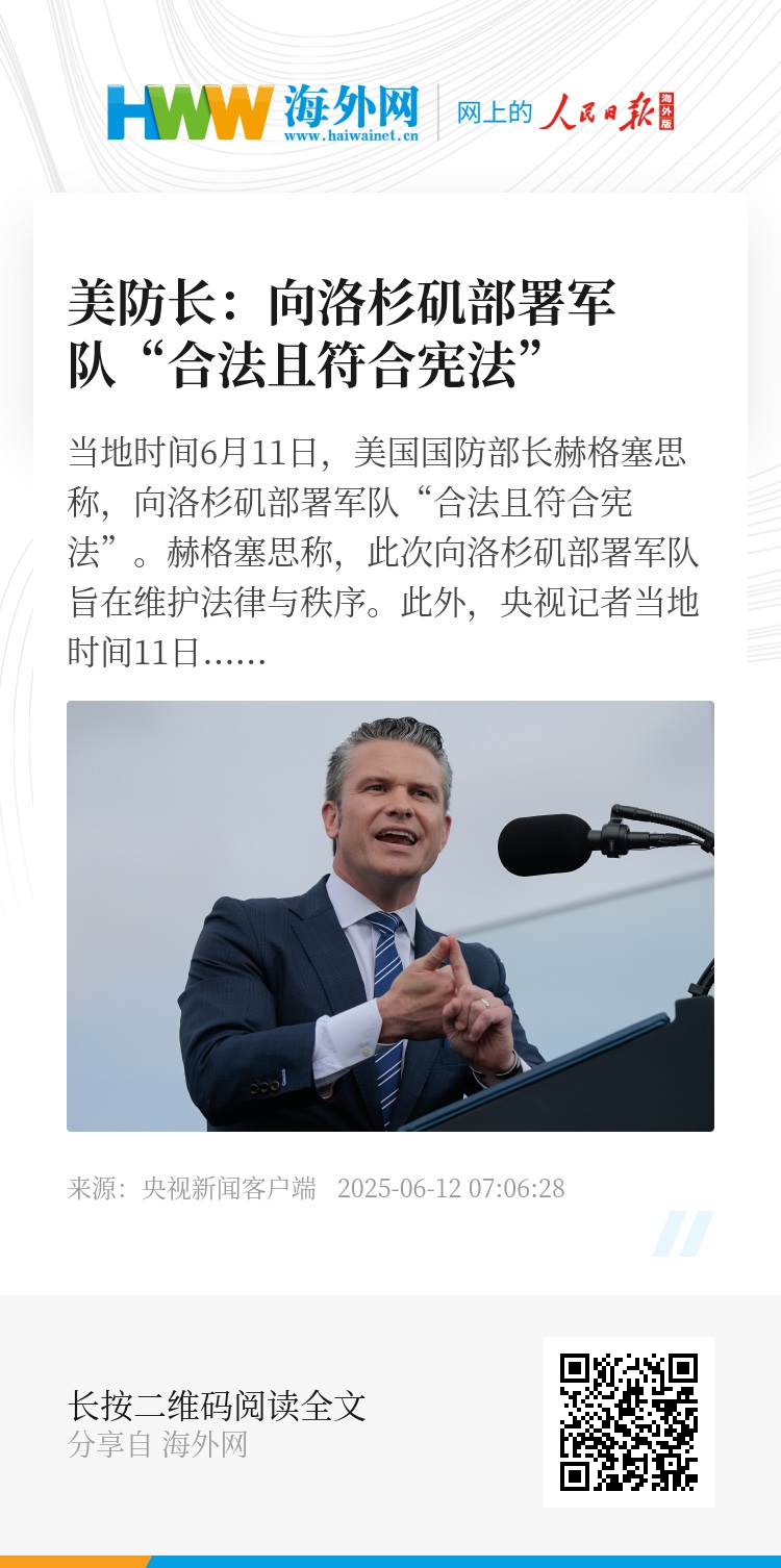 当地时间6月11日,美国国防部长赫格塞思称,向洛杉矶部署军队“合法且符合宪法”。赫格塞思称,此次向洛杉矶部署军队旨在维护法律与秩序。